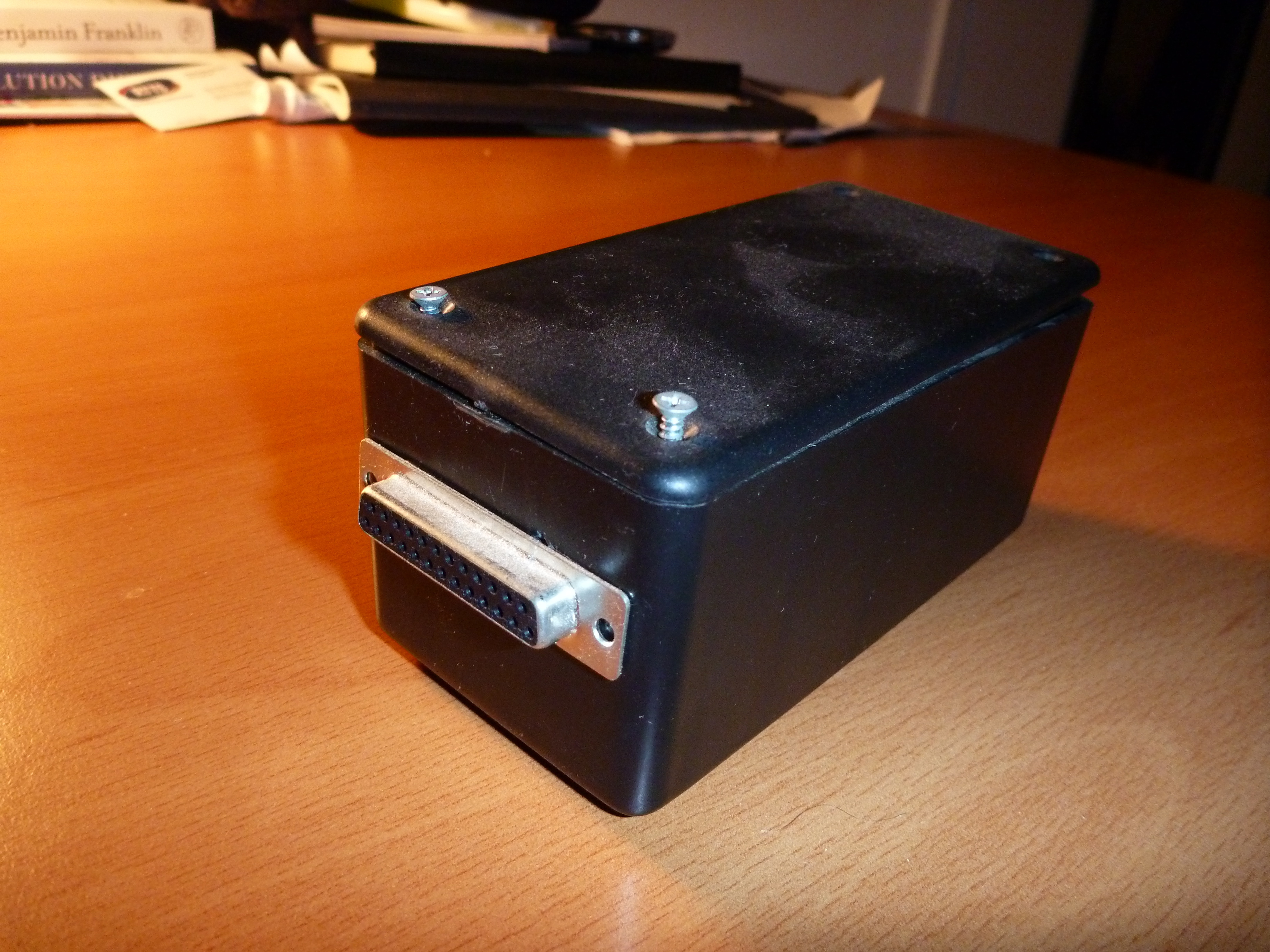 Here’s a picture of the completed case. I could barely fit everything into the box, only got 2 out of 4 screws in without fear of breaking one of the soldered connections. A parallel cable would then be connected from the box to the back of my PC.